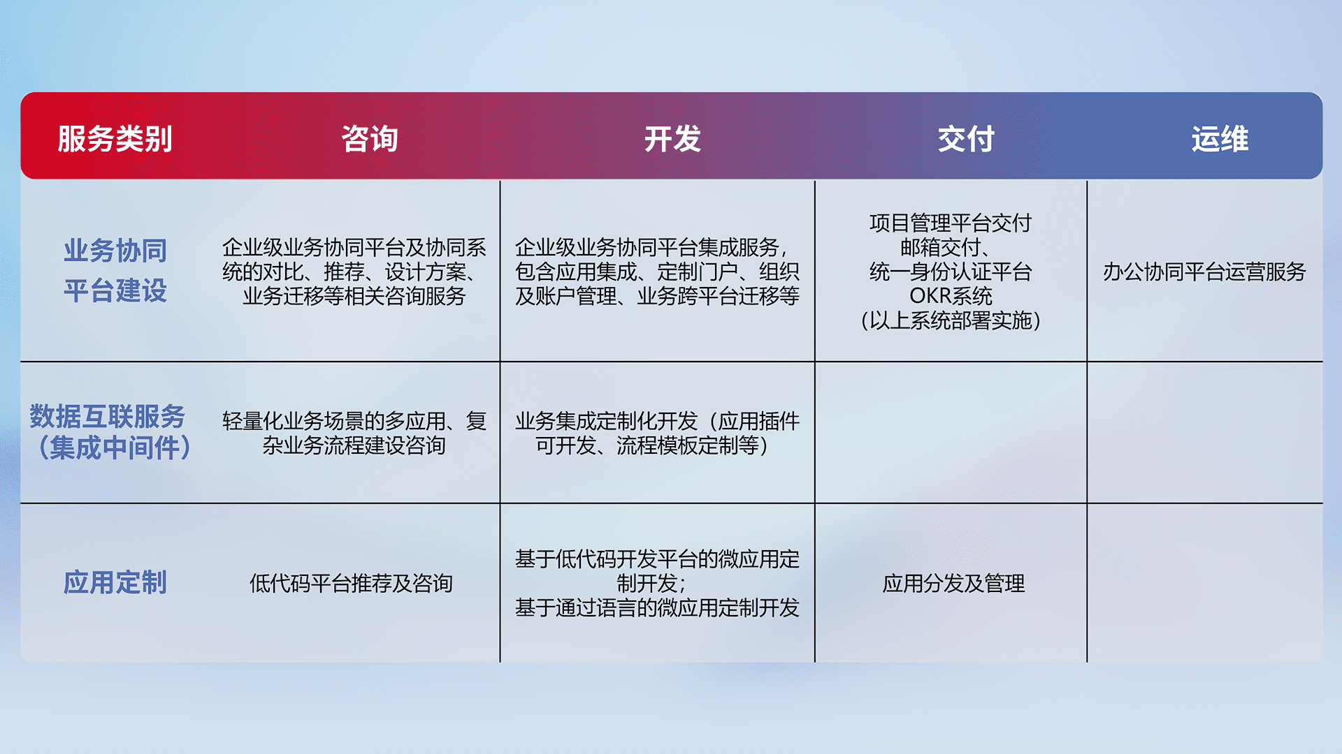 针对钉钉、、、企微、、IDaas等平台级产品提供产品的规划、、、方案、、、、交付、、定制化开发等服务,,,实现如统一协同办公、、智能客户服务、、、混合会议管理、、智能数据查询、、等业务场景,,,,实现数字化转型。。