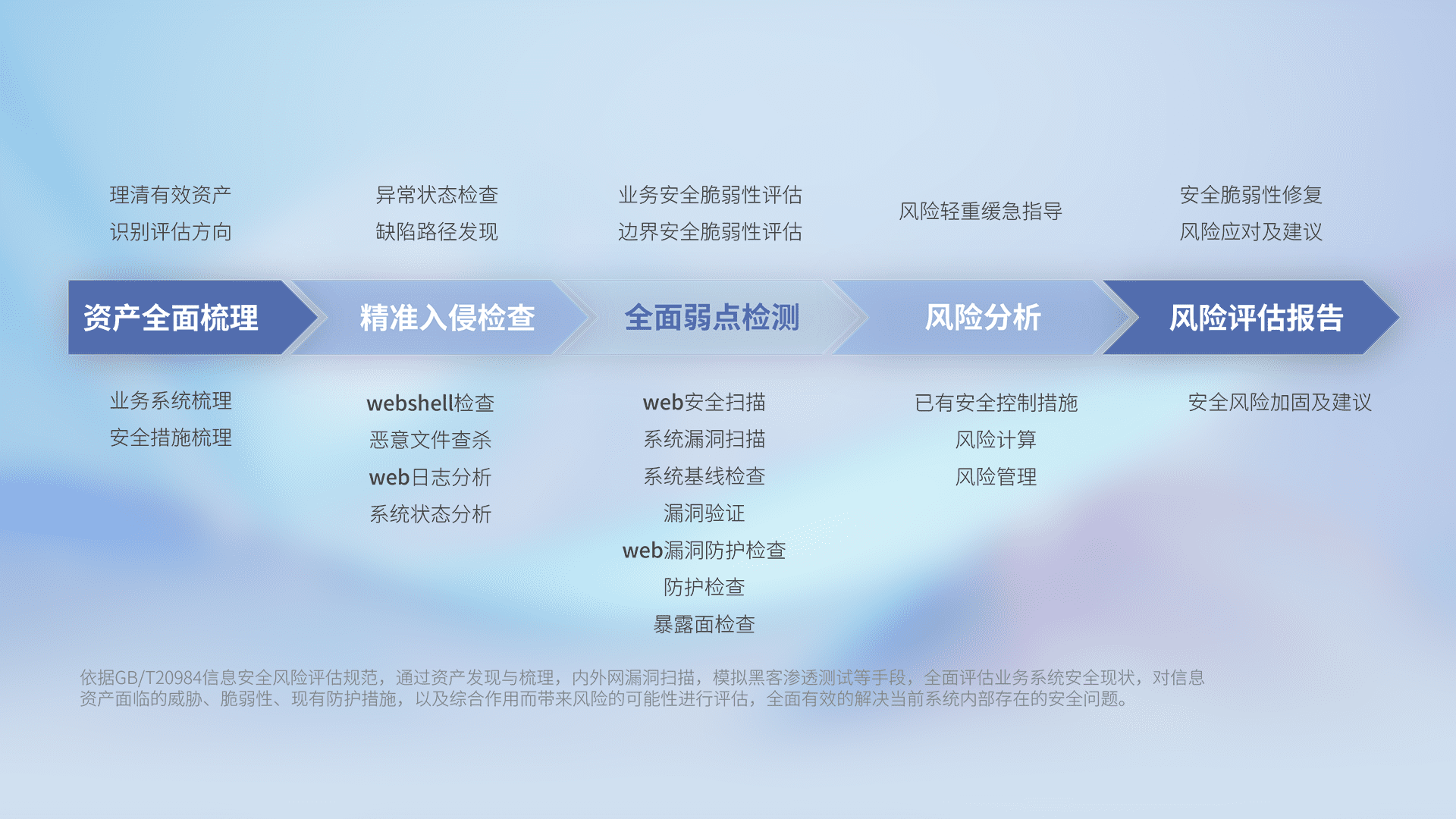 针对客户行业特性,,,以专业的安全服务+多厂商联合解决方案提供专属的一站式安全管理服务,,,,帮助客户全面感知网络空间威胁,,,基于识别、、、、检测、、、、分析、、、防护、、、监测、、响应的服务理论模型,,,从方案咨询、、、、集成交付、、评估验证、、、、优化加固、、、、运维运营,,致力于为客户提供完整的闭环管理式安全服务。。。。以实战经验为客户打造高抵御风险的安全体系,,帮助客户发现威胁、、、、对抗威胁、、、处置威胁,,不断积累安全对抗能力,,,持续保障数字化安全。。。